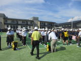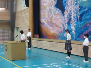 10月4日から、峡南地区の新人体育大会が行われます。その選手たちを激励する会が行われました。3年生から部活動を引き継いだ2年生・1年生が中心となるチームでの大会となります。各部から決意表明が行われ、選手宣誓をしました。そして、激励応援として、各部の旧部長・3年生や全校による応援が行われました。選手はたくさんのパワーをもらった会となりました。週末に向けて頑張っていきましょう!