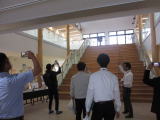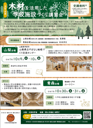 文部科学省主催の「木材を活用した学校施設づくり講習会」の会場となり、10日に講習会が行われました。全国から集まった参加者に、実際に学校をみていただきながら木材活用に関する施策説明や、木造の学校施設の説明などが学校建設に携わった役場や教育委員会、設計会社などから行われました。